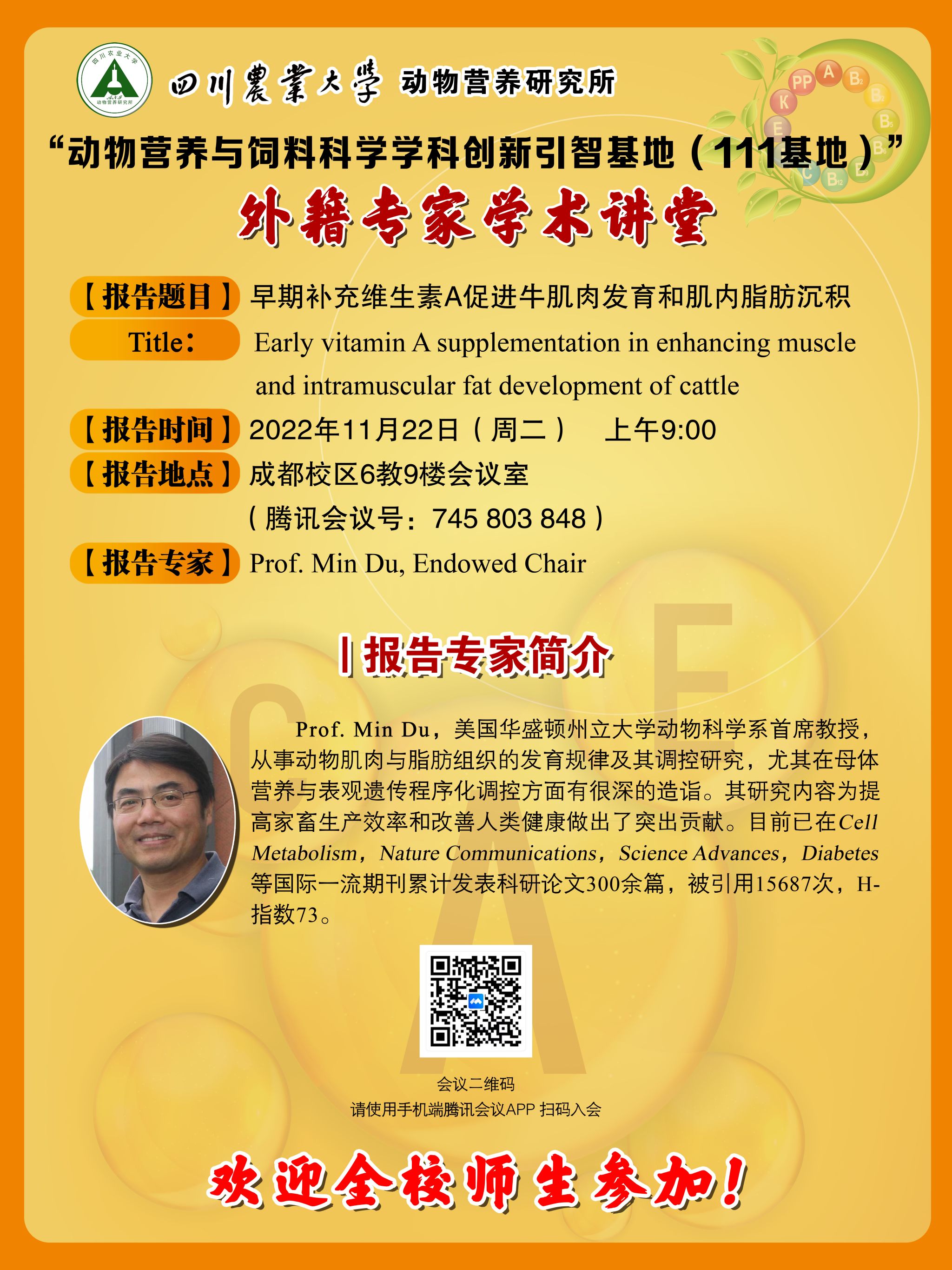 “动物营养与饲料科学学科创新引智基地(111基地)”外籍专家学术讲堂:Early vitamin A supplementation in enhancing muscle and intramuscular fat development of cattle