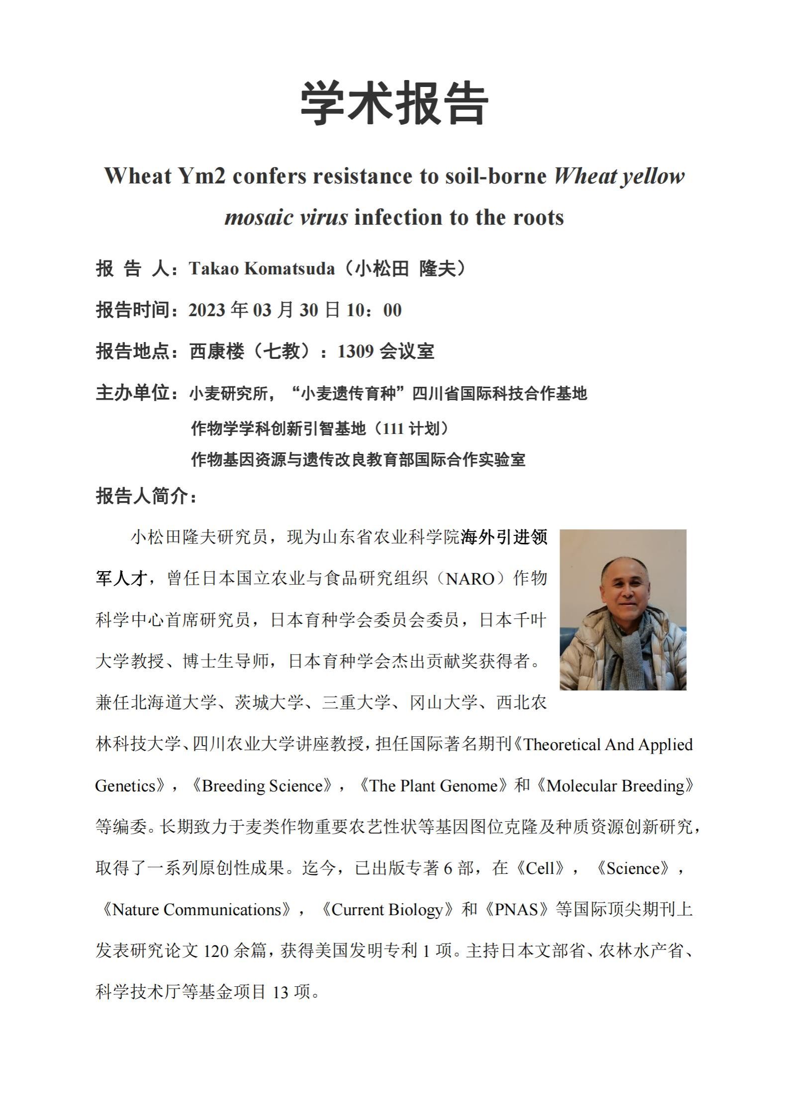 学术报告-Wheat Ym2 confers resistance to soil-borne Wheat yellow mosaic virus infection to the roots