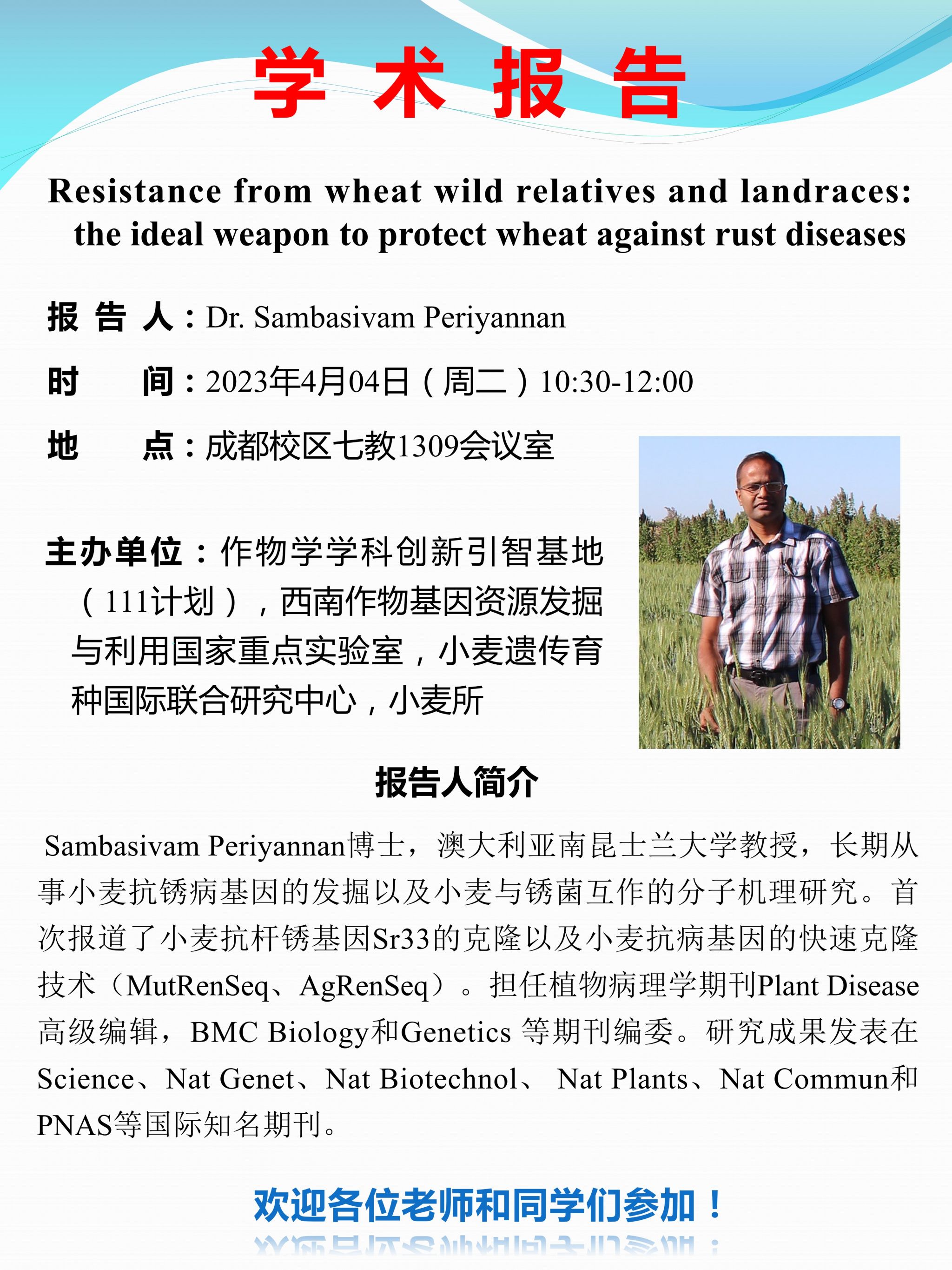 学术报告-Resistance from wheat wild relatives and landraces: the ideal weapon to protect wheat against rust diseases