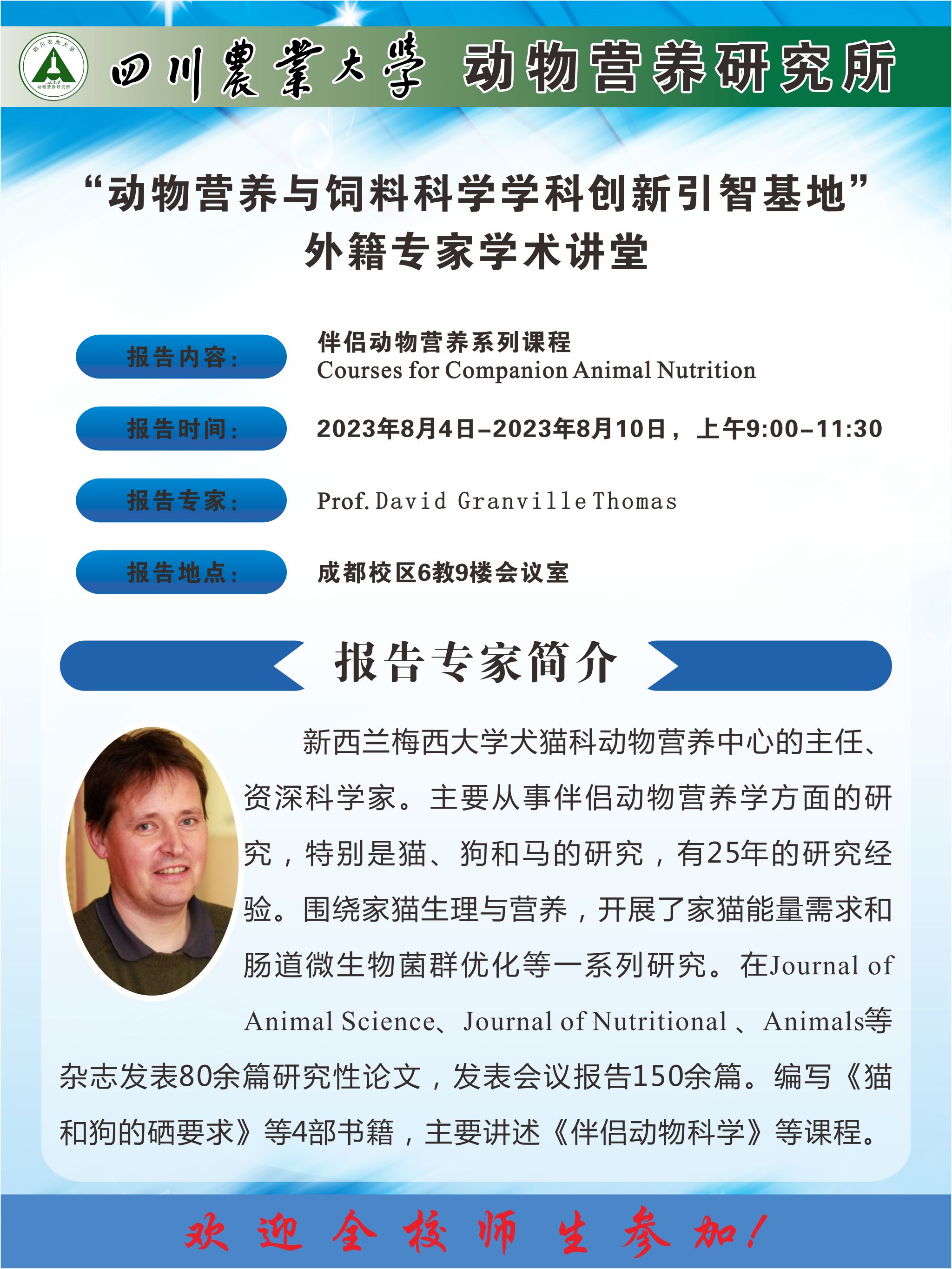 “动物营养与饲料科学学科创新引智基地” 外籍专家学术讲堂:伴侣动物营养系列课程